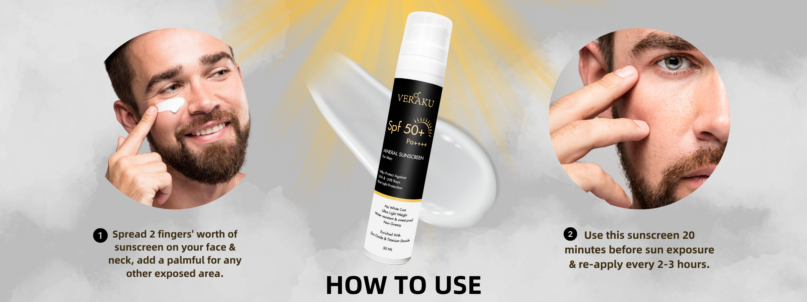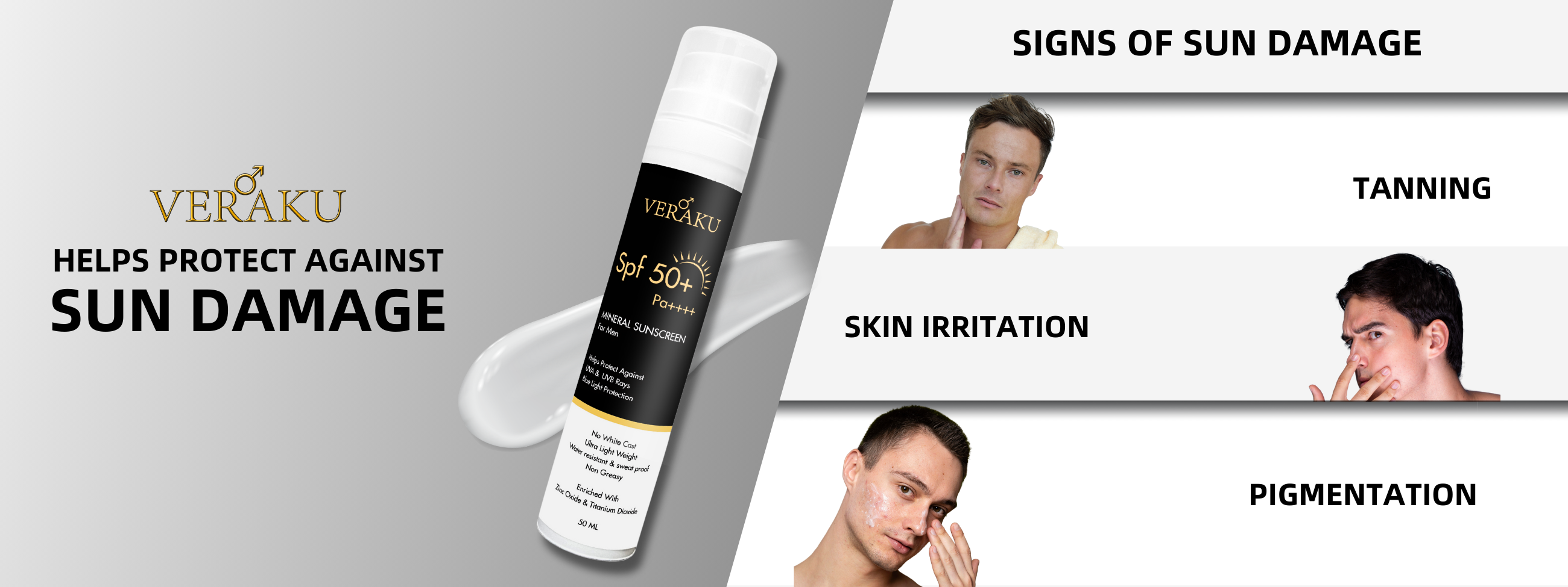 Veraku's SPF 50 Mineral sunscreen is specially formulated to provide high-quality protection from UV rays for the modern man. Sunscreen with SPF 50 and PA++++ for maximum protection against harmful UV rays. Formulated with mineral based ingredients like zinc oxide and titanium dioxide, this sunscreen provides broad spectrum protection without leaving a white cast on your skin.The benefits of zinc oxide and titanium dioxide include their ability to physically block and scatter UV rays, providing a more effective and gentle form of sun protection. These ingredients are also known for their soothing and anti-inflammatory properties, making them suitable for all skin types, including sensitive skin.Our non-greasy and ultra lightweight formula is perfect for everyday use, making it easy to incorporate into your skincare routine. It is also water resistant and sweat proof, ensuring long-lasting protection even during outdoor activities.Sunscreen is enriched with antioxidants and vitamins to help combat free radicals and environmental damage, leaving your skin looking youthful and radiant. Veraku's sunscreen is sulfate-free, non-comedogenic, and made with natural ingredients for gentle, effective skincare. Its easy application and quick absorption make it ideal for all skin types. It's a must-have addition to your daily skincare routine. Don't let the sun's harmful rays take a toll on your skin – protect yourself with our premium men's sunscreen.
